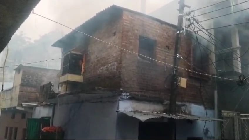 अज्ञात कारणों के चलते मकान में लगी आग, मौके पर पहुंची फायर ब्रिगेड की गाड़ी