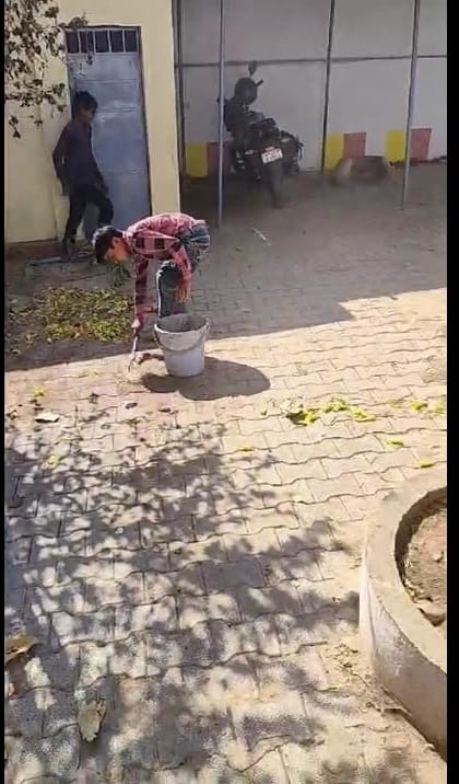 मासूम बच्चों से कराई जा रही स्कूल परिसर में साफ-सफाई