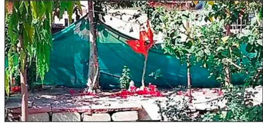 ललितपुर मेडिकल में पुनः स्थापित मूर्ति के ऊपर लगाया जा रहा टीन शेड