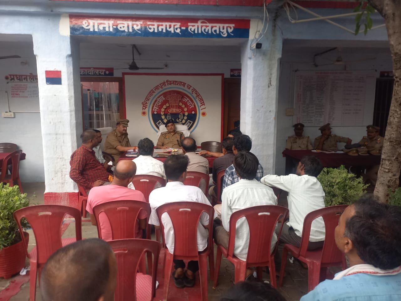 बार(ललितपुर)- सावन के पवित्र माह व मुस्लिमों के त्यौहार मोहर्रम के मद्देनजर थाना प्रांगण में पुलिस क्षेत्राधिकारी रक्षपाल सिंह की अध्यक्षता में शांति समिति की बैठक संपन्न हुई जिसमें मोहर्रम जुलूस के बारे में मुस्लिम वर्ग के लोगों से जानकारी प्राप्त की एवं ताजिया निकलने वाली रूट चार्ट के बारे में उपस्थित लोगों को बताया गया इस अवसर पर सभी लोगों से शांति व्यवस्था बनाए रखने की अपील की। वही नव आंगनतुक थाना प्रभारी अजमेर सिंह भदौरिया नें लोगों से परिचय प्राप्त किया एवं बैठक में आये सभी समुदाय और सभ्रान्त नागरिको से कस्बे में व्याप्त समस्याओ के बारे में जानकारी ली व उनके निदान पर चर्चा हुई ग्राम प्रधान से साफ सफाई की व्यवस्था बनाए रखने को कहा गया इस अवसर पर ब्लॉक प्रमुख प्रतिनिधि कल्याण सिंह लोधी, अकील खा, नसीम खान, भूपेन्द्र सिंह, जितेंद्र सेवरिया, राम लखन, जब्बार अली, मतीम खान, राजेंद्र लोधी, शहीद खान, के अलावा क्षेत्र के हिंदू या मुस्लिम वर्ग के सभी लोग मौजूद रहे।