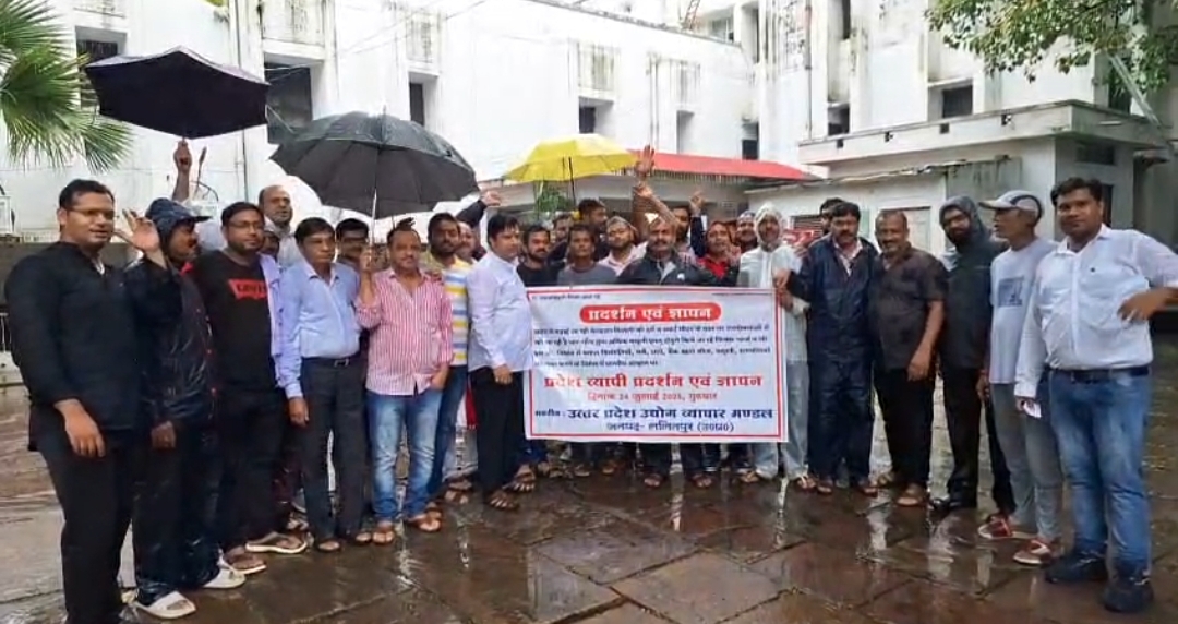 ललितपुर। बिजली विभाग व जीएसटी के खिलाफ पूरे प्रदेश में उत्तर प्रदेश उद्योग व्यापार मंडल के द्वारा धरना प्रदर्शन किया जा रहा है। उत्तर प्रदेश उद्योग व्यापार मंडल के आव्हान पर जिला इकाई द्वारा बरसते पानी में सैकड़ो व्यापारियों के साथ मिलकर जगदीश मंदिर से कलेक्ट्रेट तक जीएसटी व बिजली विभाग के खिलाफ प्रदर्शन करते एक ज्ञापन जिला अधिकारी को सौंपा।