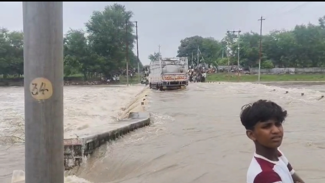 पानी मे ऐक मिनी ट्रक बह कर पुल के बीचो-बीच फंसा