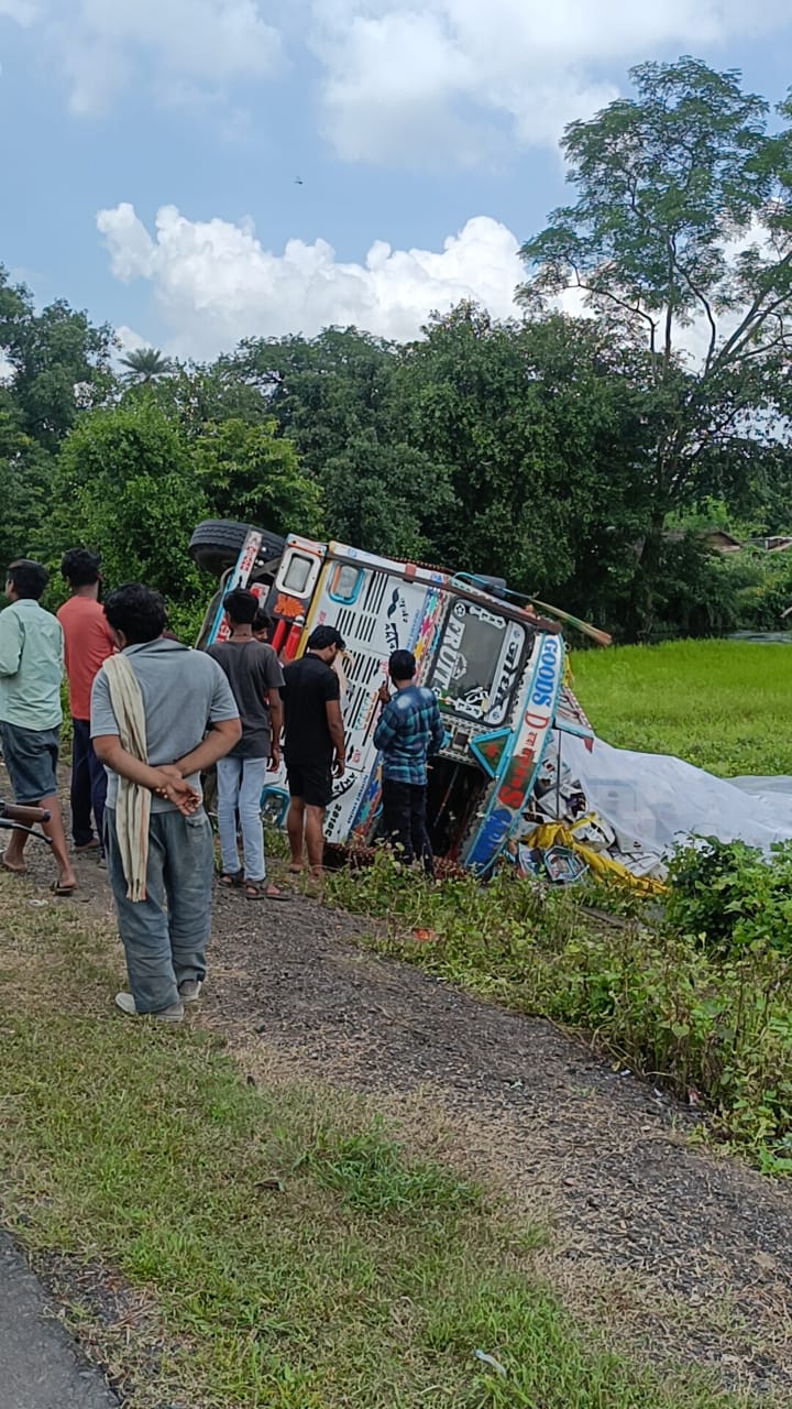 गाय को बचाने के चक्कर में सेव से भरा ट्रक पलटा
