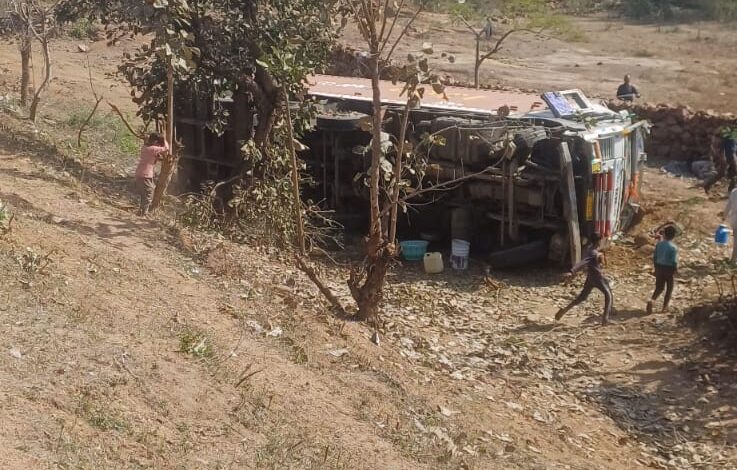 तेज रफ्तार ट्रक अनियंत्रित होकर हाईवे के पास जा पलटा, चालक व कंडक्टर घायल