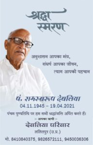 वरिष्ठ कांग्रेस नेता पं. रामस्वरूप देवलिया की पुण्यतिथि कल