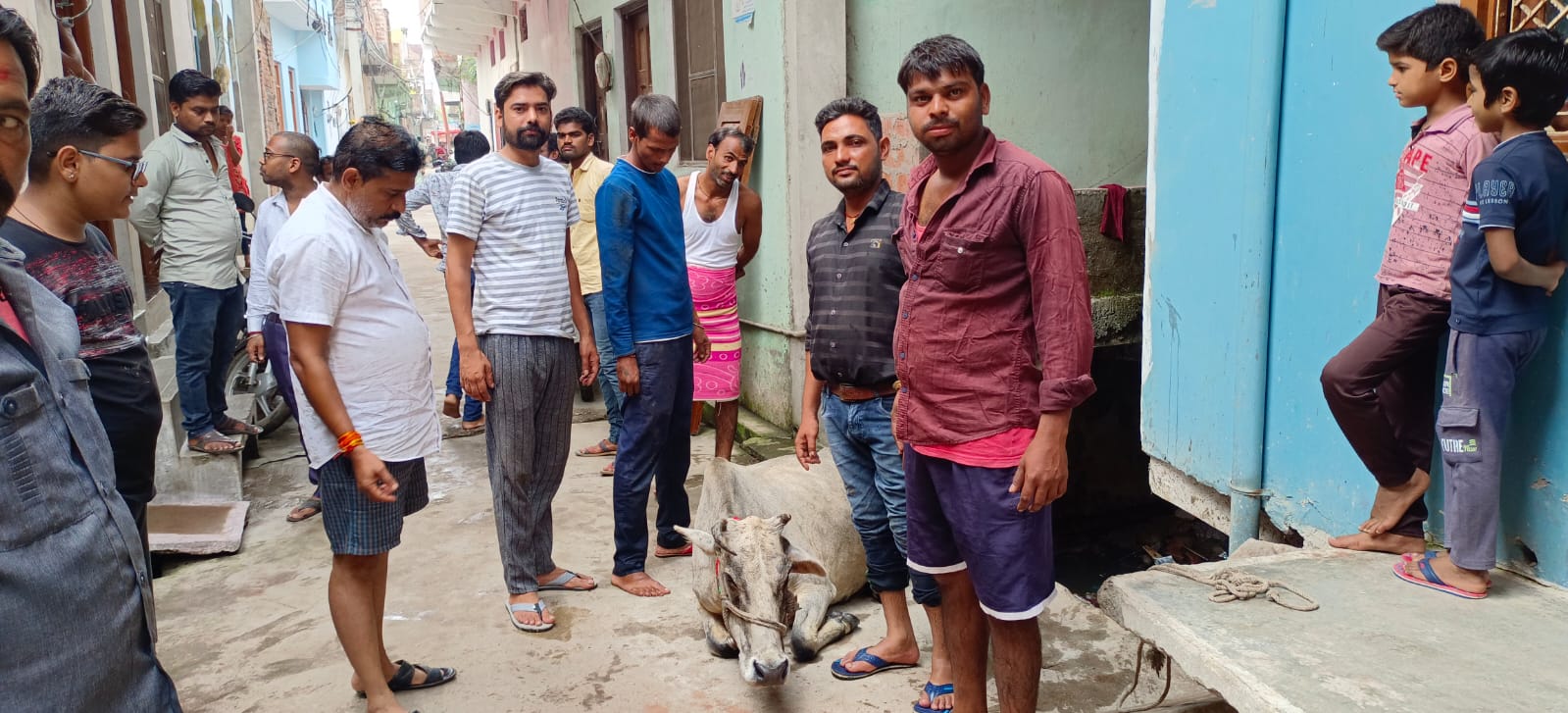 नाले में गिरी गाय को सुबह मोहल्ले वालों की मदद से निकाला गया बाहर।
