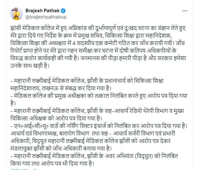 Home/झांसी मेडिकल कॉलेज अग्निकांड में में बड़ी कार्रवाई प्रधानाचार्य सहित तीन को किया गया निलंबित, डिप्टी सीएम ब्रजेश पाठक के निर्देश पर हुई कार्रवाई/20241127_160911 20241127_160911